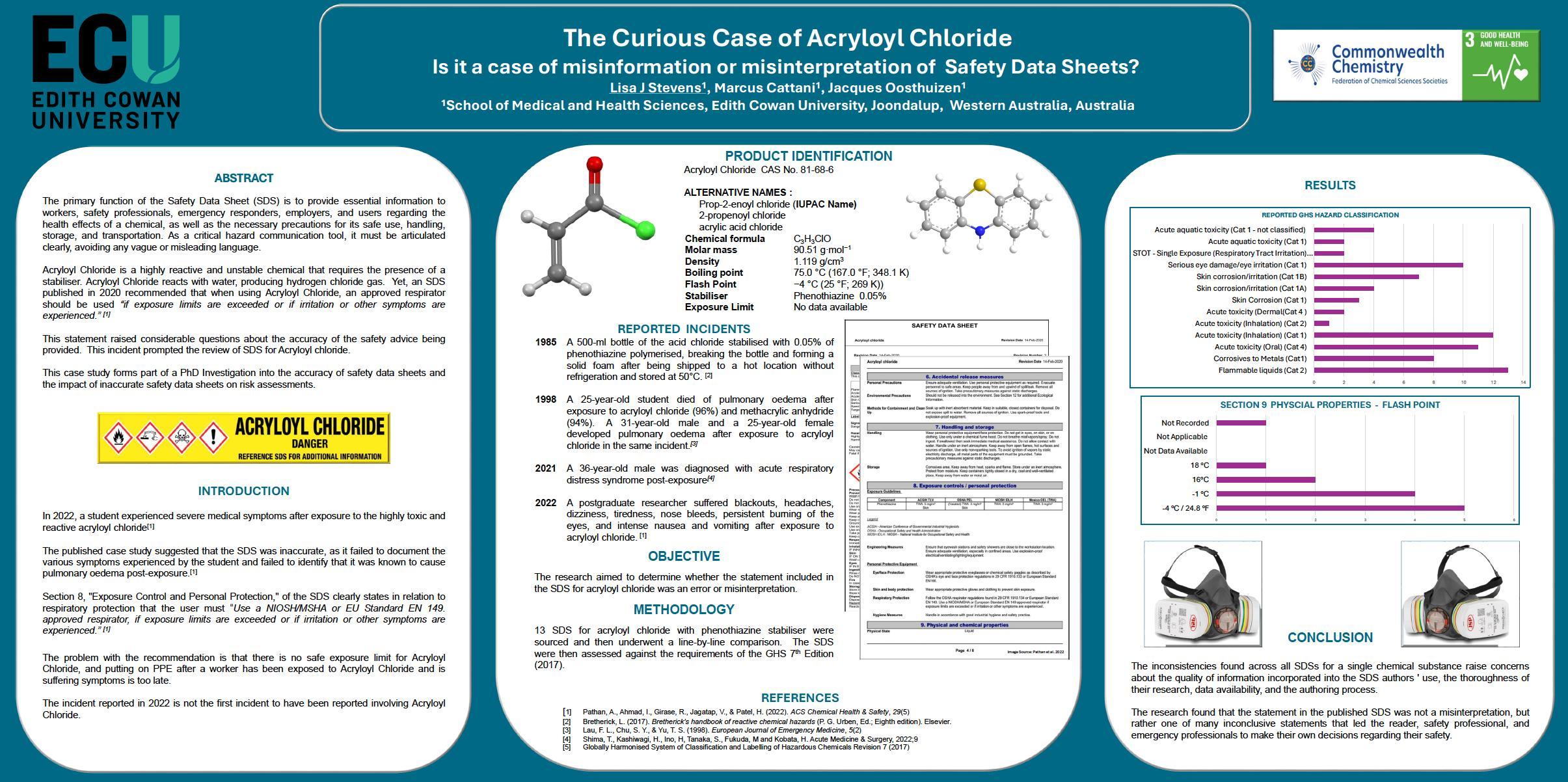 The team at Lisa J Stevens and Associates are pleased to announce that our Principal Health and Safety Consultant, Lisa Stevens, was recently awarded a prize in the Commonwealth Chemistry Poster Competition. Lisa's poster entitled The Curious Case of Acryloyl Chloride – a case of misinformation or misinterpretation? Was awarded one of the ten prizes available in the Sustainable Development Goal 3 - Good health and well-being section of the competition. Lisa's poster was just one of 109 posters focusing on the UN's Sustainable Development Goal - Good Health and Well-being. Lisa's PhD research examines the impact of misleading and erroneous SDS and how they inform workplace risk assessment. Lisa is highly honoured to be one of two Australians mentioned during the prize-giving. Lisa is incredibly honoured to have my poster titled “The Curious Case of Acryloyl Chloride - A Case of Misinformation or Misinterpretation?” recognised as one of the winners in the UN Sustainable Development Goal 3 Health and Wellbeing Section at the Commonwealth Chemistry Society’s 6th Poster Competition.