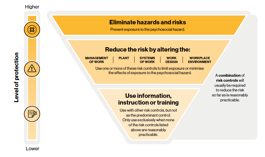 Employers: Employers have a responsibility to eliminate risks to health and safety so far as is reasonably practicable, and if it is not reasonably practicable to eliminate risks to health and safety, reduce those risks so far as is reasonably practicable. With psychological hazards, the employer must, in consultation with their employees or via the health and safety representatives, identify any psychological hazards, assess the associated risks to health or safety, identify and implement suitable controls and develop a process for monitoring and reviewing controls.